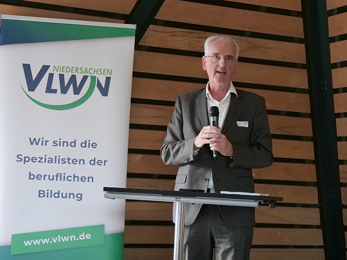 Prof. Dr. Günter Hirth, Abteilungsleiter Berufsbildung bei der IHK, sagte in seinem Grußwort: „Aufgabe der beruflichen Bildung ist es, junge Menschen fachlich und persönlich aufs Gleis zu setzen, damit sie eine Zukunft haben. Da gehen wir mit dem VLWN Hand in Hand und stoßen gemeinsam Entwicklungsprozesse an. Das Alleinstellungssystem der beruflichen Bildung bietet dafür eine riesige Klaviatur von der Berufseinstiegsklasse bis hin zu dualen Ausbildungsgängen im Zusammenspiel mit Hochschulen. Damit bieten die BBSen der zunehmend heterogeneren Schülerschaft, deren Entwicklung nicht erst seit der Flüchtlingswelle 2015 voranschreitet, ein ideales Angebot. Erfreulich ist auch, dass über die Krise der Pandemie hinweg die Berufsbilder in der Lage waren, digital zu unterrichten. Anfänglich etwas holprig, wurde es mit der Zeit deutlich besser. Damit ist die Basis geschaffen für deutlich mehr Distanzunterricht, auch, um Standorte in der Fläche zu halten. Das ist elementar gerade für den ländlichen Raum, um Ausbildungsangebote am Ort zu erhalten, Solange allerdings unrenovierte Tropfsteinhöhlen aus den 1960er Jahren als Schulen deklariert werden – und das gilt auch für die technische Ausstattung – hat es die berufliche Bildung schwer, attraktiv zu bleiben. Hier muss kräftig investiert werden.“