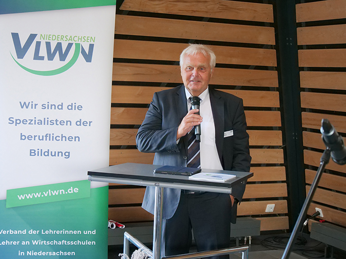 Prof. Dr. Günter Hirth, Abteilungsleiter Berufsbildung bei der IHK, sagte in seinem Grußwort: „Aufgabe der beruflichen Bildung ist es, junge Menschen fachlich und persönlich aufs Gleis zu setzen, damit sie eine Zukunft haben. Da gehen wir mit dem VLWN Hand in Hand und stoßen gemeinsam Entwicklungsprozesse an. Das Alleinstellungssystem der beruflichen Bildung bietet dafür eine riesige Klaviatur von der Berufseinstiegsklasse bis hin zu dualen Ausbildungsgängen im Zusammenspiel mit Hochschulen. Damit bieten die BBSen der zunehmend heterogeneren Schülerschaft, deren Entwicklung nicht erst seit der Flüchtlingswelle 2015 voranschreitet, ein ideales Angebot. Erfreulich ist auch, dass über die Krise der Pandemie hinweg die Berufsbilder in der Lage waren, digital zu unterrichten. Anfänglich etwas holprig, wurde es mit der Zeit deutlich besser. Damit ist die Basis geschaffen für deutlich mehr Distanzunterricht, auch, um Standorte in der Fläche zu halten. Das ist elementar gerade für den ländlichen Raum, um Ausbildungsangebote am Ort zu erhalten, Solange allerdings unrenovierte Tropfsteinhöhlen aus den 1960er Jahren als Schulen deklariert werden – und das gilt auch für die technische Ausstattung – hat es die berufliche Bildung schwer, attraktiv zu bleiben. Hier muss kräftig investiert werden.“