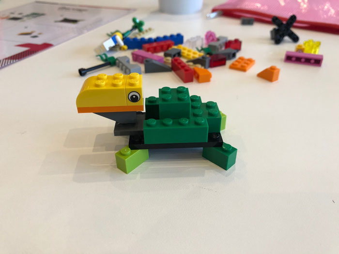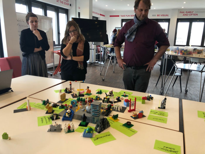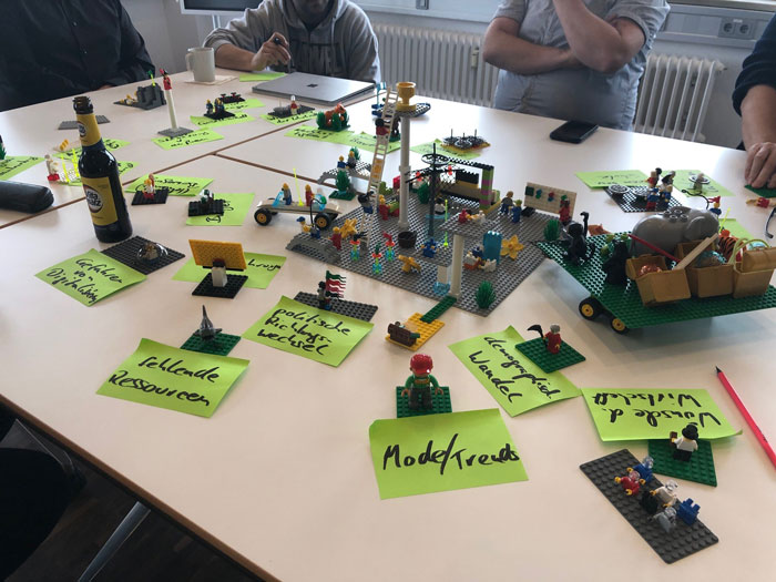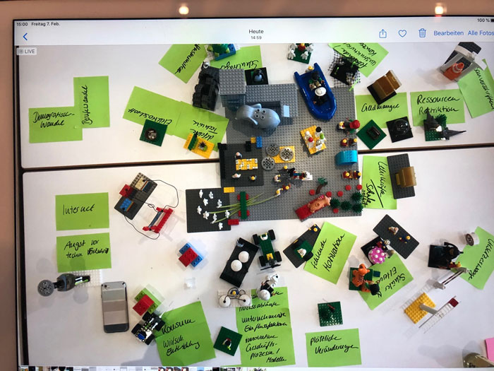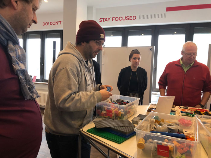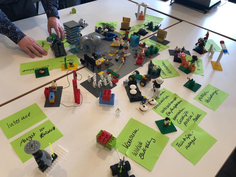 Nach der Aufteilung in zwei Gruppen erprobten wir unsere Baufähigkeiten mit Startersets von Lego und stiegen somit direkt in die Methode „Lego Serious Play“ ein. Bei gemeinsamen Erinnerungen an die Kindheit lernten wir uns und das heutige Arbeitsmaterial bei zwei Aufwärmübungen näher kennen.