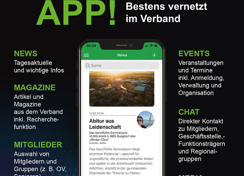 Am Anfang war das Internet. Seither wird die Kommunikation immer digitaler. Newsletter, X, Facebook, Instagram, LinkedIn… – all diese Kommunikationskanäle bespielt auch der VLWN, um die Kolleginnen und Kollegen schnell und umfassend über alle relevanten Themen rund um die berufliche Bildung zu informieren. Mit der VLWN-App ist jetzt ein weiterer Kanal hinzugekommen, der vor allem für den internen Austausch zahlreiche Mehrwerte bietet und allen Mitgliedern den schnellen Zugriff auf Informationen und Nachrichten aus dem Verband ermöglicht. Von A wie „Allgemeine Infos zum VLWN“ über P wie „Positionspapiere“ bis hin zu aktuellen S, T, V wie „Terminen, Veranstaltungen und Servicethemen“ reicht die Bandbreite der in sechs Kategorien untergliederten Nutzeroberfläche. Hier kann man jederzeit die aktuellen News anschauen, sich zu Veranstaltungen anmelden oder die aktuellen Rechtsvorschriften einsehen. Vor allem aber fördert die App die direkte Vernetzung untereinander und fördert so den Dialog miteinander. Die App steht im App-Store zum kostenlosen Download zur Verfügung. Einfach aufs Smartphone oder Tablet laden und hat „seinen/ihren“ Verband jederzeit zur Hand beziehungsweise in der Tasche.