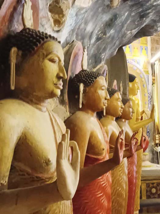 In der unerwartet weitläufigen und vielfältigen Anlage bewundern wir verschiedene wertvolle historische Reliefs, Skulpturen und Gemälde aus allen Epochen bis zur Neuzeit. Hier haben 500 Mönche die Lehre Buddhas zum ersten Mal auf Talipotpalme niedergeschrieben. Das Felsenkloster besteht aus mehreren Grotten mit schönen Wandmalereien und furchterregenden Darstellungen der buddhistischen Hölle.