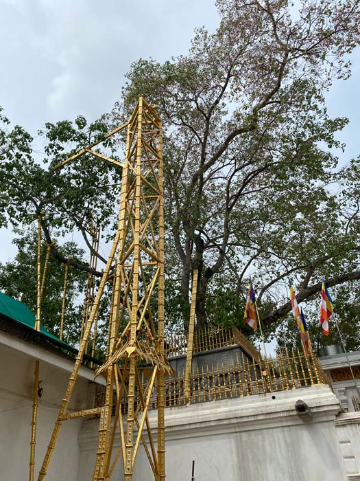 Schon eine spezielle Story. Der heilige Ficus Religiosa, der hier steht und von einem Gerüst gehalten wird, ist über 2300 Jahre alt und stammt ursprünglich aus Nordindien. Unter seinem Mutterbaum wurde Buddha zum Erleuchteten. Seither gilt er als so heilig, dass vielerorts Ableger gepflanzt wurden. Da das indische Original zerstört wurde, gilt dieser hier als der älteste Bodhibaum der Welt.