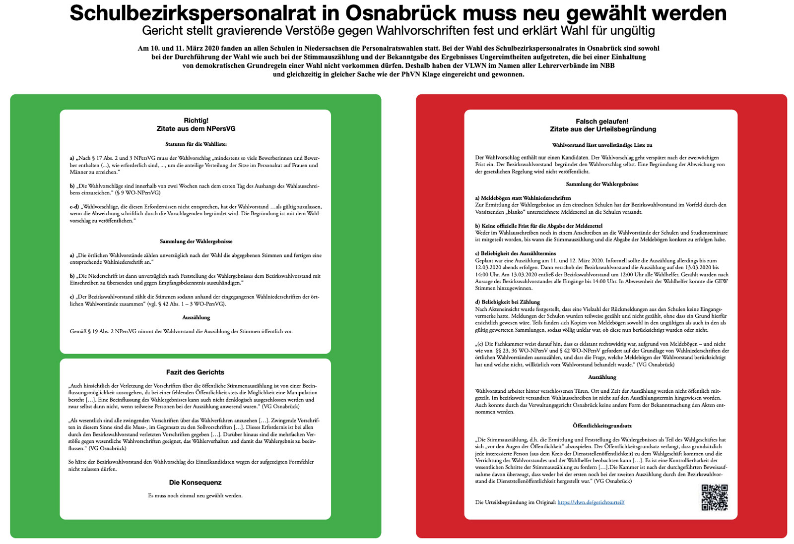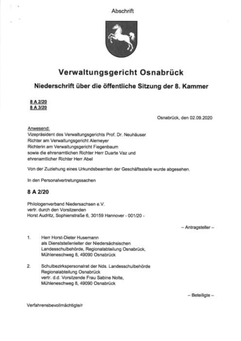 Der Verband für Lehrerinnen und Lehrer an Wirtschaftsschulen in Niedersachsen (VLWN) und der Philologenverband Niedersachsen (PHVN) haben, unterstützt von allen Lehrerverbänden im Niedersächsischen Beamtenbund, vor der zuständigen Fachkammer des VG Osnabrück Einspruch gegen die Wahl zum SBPR vom März 2020 erhoben. Denn sowohl bei der Durchführung der Wahl als auch bei der Stimmenauszählung durch den Bezirkswahlvorstand und bei den Bekanntgaben der Wahlergebnisse ist es zu gravierenden Rechtsverstößen gekommen.