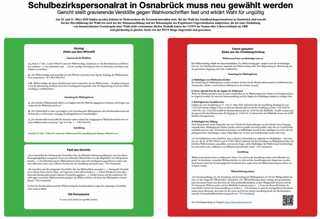 Gesagt, getan. Der VLWN hat auf Bitte und unter tatkräftiger Unterstützung seines Mitglieds Manfred Glausers Anfang April durch Rechtsanwalt Immanuel Duram (Kanzlei Cherek) ein sogenanntes Wahlanfechtungsverfahren vor dem Verwaltungsgericht Osnabrück eingeleitet. Das Verwaltungsgericht kippte die Wahl daraufhin nach einer mündlichen Verhandlung – antragsgemäß – wegen gravierender Verstöße gegen elementare Wahlgrundsätze, wie sie im Niedersächsischen Personalvertretungsgesetz (NPersVG), der Wahlordnung für die Personalvertretungen im Land Niedersachsen sowie im Grundgesetz fixiert sind.