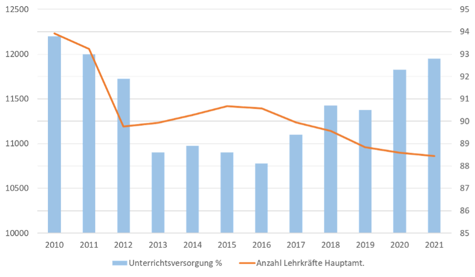 Ein etwas anderes Bild zeigt sich bei der Betrachtung der Unterrichtsversorgungsquote an den berufsbildenden Schulen in Niedersachsen. Sie deutet auf einen wesentlich höheren Bedarf an Lehrkräften hin als tatsächlich verfügbar sind. Im Jahr 2010 betrug die Unterrichtsversorgung zum 15. November 93,8 % (91,6 % Theorie und 102,1 % Fachpraxis). In den folgenden Berichtsjahren ging der Wert leicht zurück und betrug 2021 zum gleichen Stichtag 92,8 % (93,1 % Theorie und 91,6 % Fachpraxis; mk.niedersachsen, 2022, S. 33). Wie diese Entwicklung zu interpretieren ist, zeigt ein genauerer Blick auf die Ist- und Soll-Stunden, deren Quotient den Versorgungswert darstellt. Die Ist-Stunden ergeben sich aus den Stundentafeln der jeweiligen Bildungsgänge (EB-BbS, Abs. 1) und geben an, in welchem Umfang die Unterrichtsstunden mit den zur Verfügung stehenden Lehrkräften abgedeckt werden können. Die Berechnung der Soll-Stunden ist ebenfalls in der EB-BbS in Abs. 3 Nr. 2 festgelegt. Sie werden den Schulen im Budgetierungsverfahren zugeteilt und ergeben sich je nach Schulform aus einem schülerbezogenen Sollstundenwert unter Berücksichtigung von Klassengrößen. Verkürzt kann gesagt werden ─ die Ist-Stunden sind von den zur Verfügung stehenden Lehrkräften und die Soll-Stunden von der Anzahl der zu unterrichtenden Schüler*innen sowie ihrer Gruppierung abhängig. Bei einer Quote von unter 100 reichen die verfügbaren Kapazitäten rechnerisch nicht aus, um das Unterrichtsangebot vollständig abzudecken.