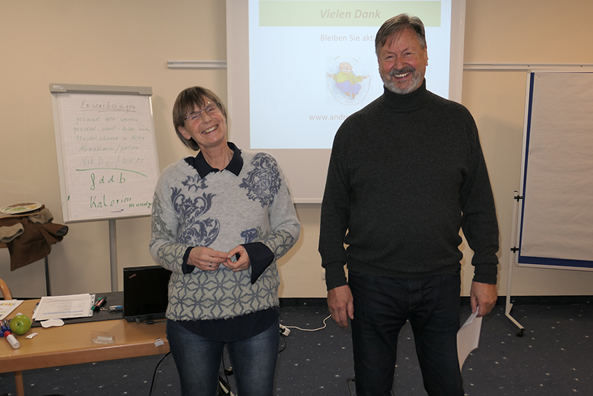 Nach der allgemeinen Einführung ins Thema „Einfach gesünder in den Ruhestand starten“ und zwei hoch informativen Stunden rund um die richtige Ernährung, war es Zeit, in Bewegung zu kommen. Und das im doppelten Wortsinn. Dr. Andrea Trappe motivierte alle dazu, ein paar leichte Bewegungsübungen zu absolvieren, die zum Muskelaufbau beitragen, die Balancefähigkeit steigern und die man ganz einfach in den Alltag einbauen kann: Mit den Armen kreisen, Daumen und Zeigefinger öffnen und schließen, an die Wand anlehnen und die Beine abwechselnd schwingen, rückwärts gehen, vorwärts auf einer imaginären Linie balancieren.