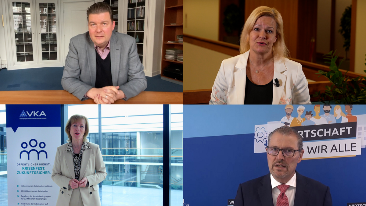 Auch die Sozialpartner zollen den Beschäftigten im öffentlichen Dienst für Ihre Leistung in der Krise großen Respekt. Arbeitgeber-Präsident Rainer Dulger, VKA Präsidentin Karin Welge sowie der stellvertretende Vorsitzende der Tarifgemeinschaft deutscher Länder Andreas Dressel sind sich darüber hinaus einig: Ein starker und funktionsfähiger öffentlicher Dienst ist wichtige Voraussetzung für eine florierende Wirtschaft.